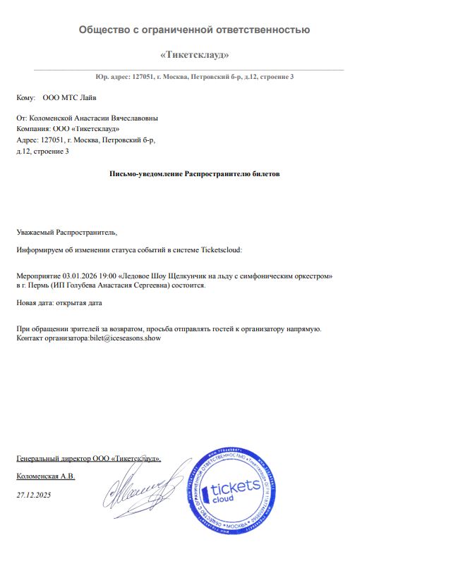 Уважаемый клиент! Спешим сообщить, что по информации, полученной от организатора, ледовое шоу «Щелкунчик на льду с симфоническим оркестром», запланированное на 03 января 2026 года в 15:00 на площадке УДС «Молот», перенесено на открытую дату. Новая дата спектакля будет объявлена дополнительно. Ранее приобретенные билеты действительны, обменивать их не нужно. По вопросам возврата билетов обращайтесь, пожалуйста, к организатору спектакля по электронной почте: bilet@iceseasons.show. С уважением, команда поддержки Ticketland.