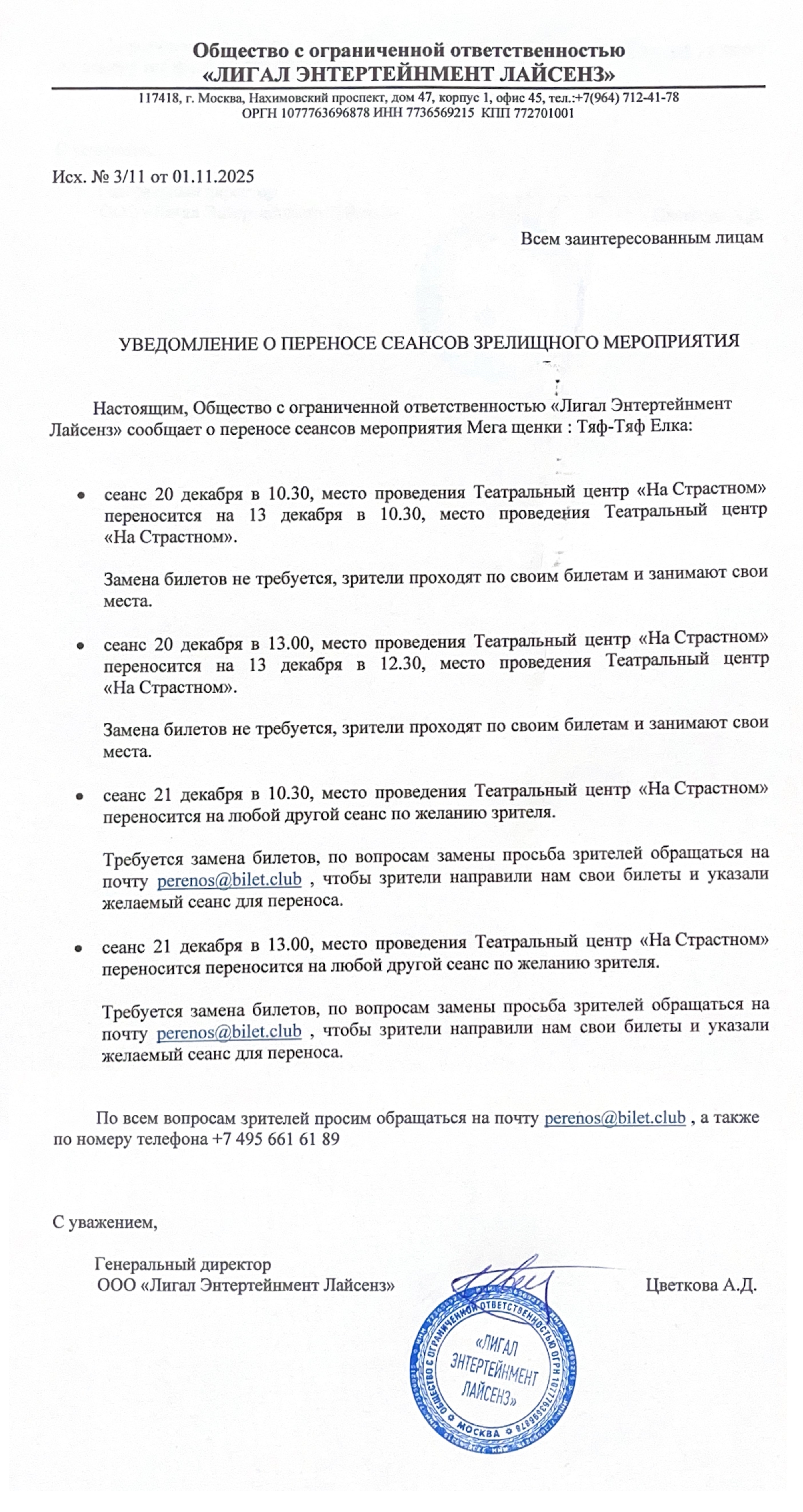 Уважаемый клиент! Спешим сообщить, что по информации, полученной от организатора, спектакль «Мега Щенки: Тяф-тяф Ёлка»: - запланированный на 20 декабря 2025 года в 10:30 в Театре «На Страстном», перенесён на 13 декабря 2025 года, начало в 10:30. - запланированный на 20 декабря 2025 года в 13:00 в Театре «На Страстном», перенесён на 13 декабря 2025 года, начало в 12:30. Ранее приобретенные билеты действительны на новую дату, обменивать их не нужно. По всем вопросам обращайтесь, пожалуйста, к организатору спектакля по электронной почте perenos@bilet.club или по номеру телефона: +7 (495) 661-61-89. С уважением, команда поддержки Ticketland.