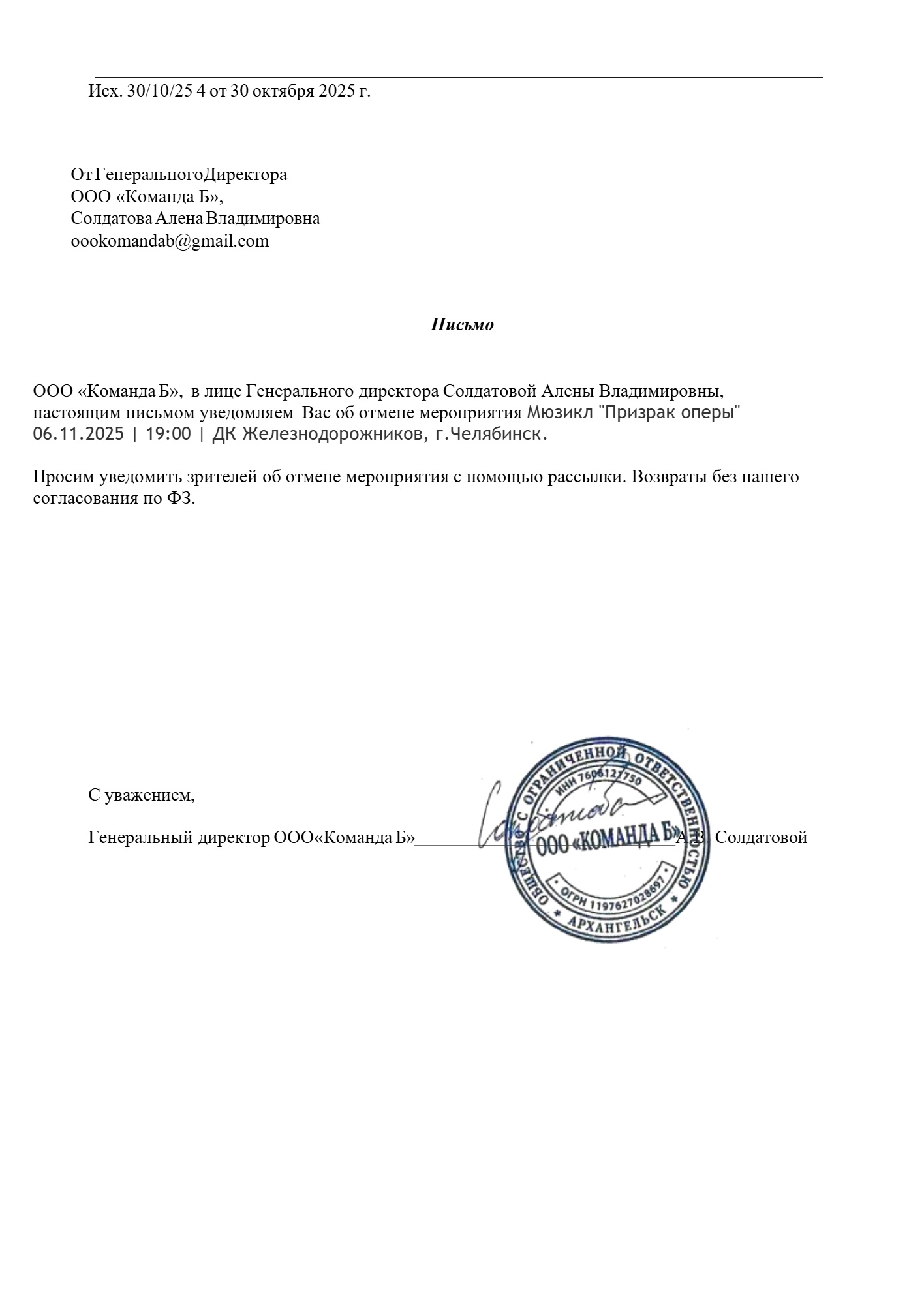 Уважаемый клиент! Спешим сообщить, что по информации, полученной от организатора, мюзикл «Призрак оперы», запланированный на 6 ноября 2025 года в 19:00 в ДК Железнодорожников, отменен. Деньги за электронные билеты вернутся автоматически в полном объёме на карту, с которой была произведена оплата. Если вы купили билет в кассе Ticketland.ru за наличный расчет, то обратитесь, пожалуйста, на почту: vozvrat@ticketland.ru. С уважением, команда поддержки Ticketland.