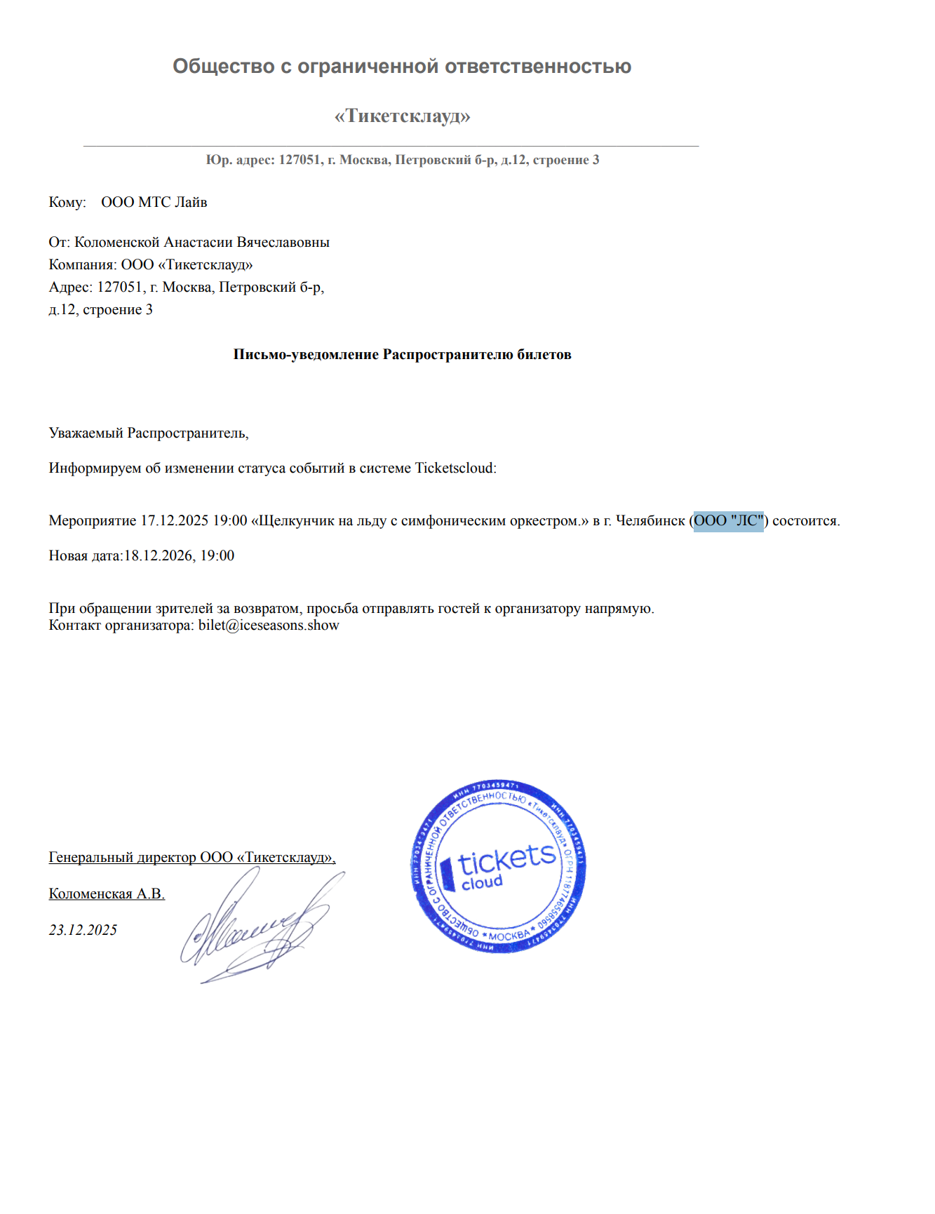 Уважаемый клиент! Спешим сообщить, что по информации, полученной от организатора, спектакль «Щелкунчик на льду с симфоническим оркестром», запланированный на 02 января 2026 года в 15:00 в ЛДС «Юбилейный», перенесён на 27 декабря 2026 года, начало в 15:00. Ранее приобретенные билеты действительны, обменивать их не нужно. По вопросам возврата билетов обращайтесь, пожалуйста, к организатору спектакля по электронной почте: bilet@iceseasons.show. С уважением, команда поддержки Ticketland.