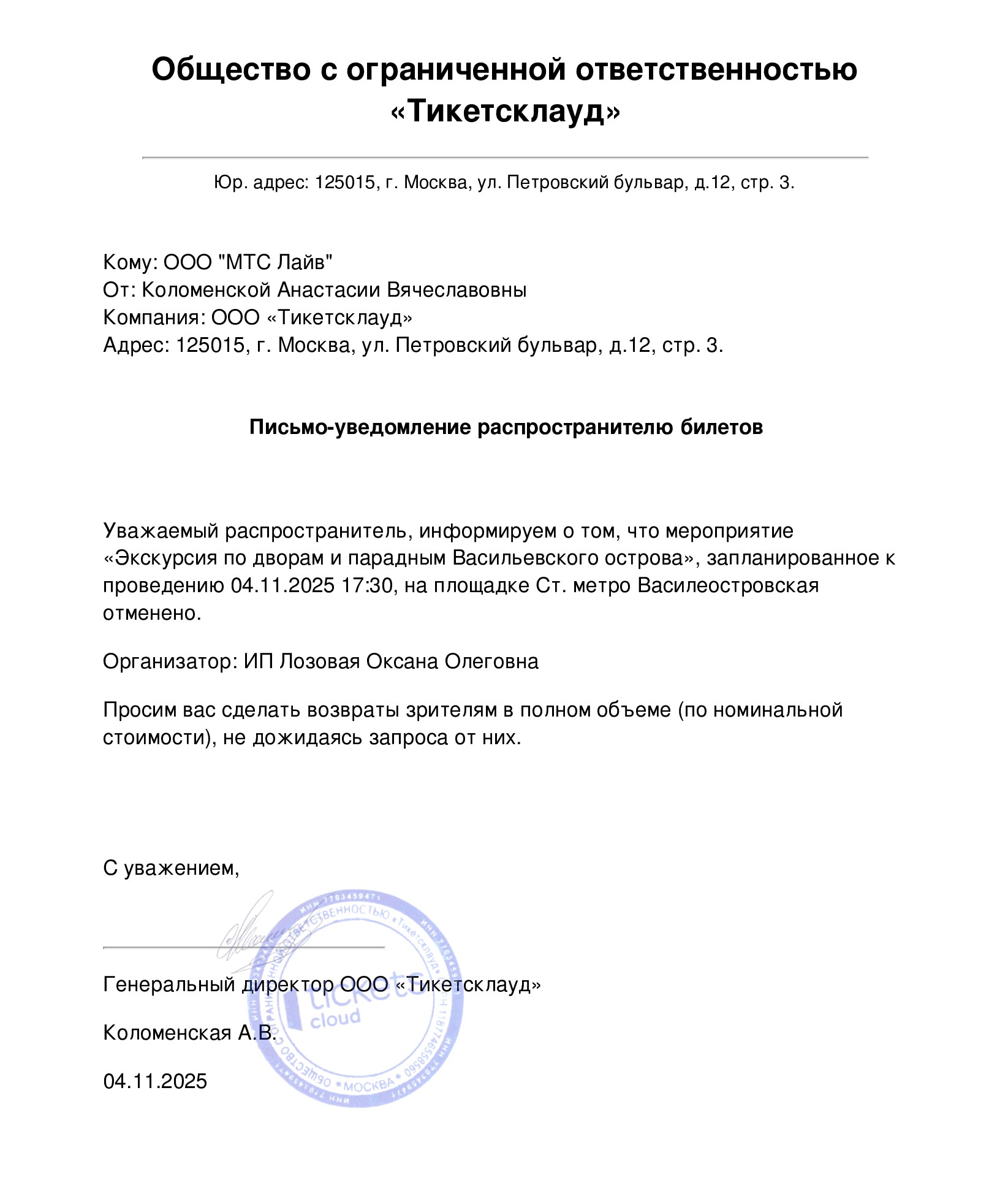 Уважаемый клиент! Спешим сообщить, что по информации, полученной от организатора, экскурсия по дворам и парадным Васильевского острова, запланированная на 4 ноября 2025 года в 17:30, отменена. Деньги за электронные билеты вернутся автоматически в полном объёме на карту, с которой была произведена оплата. Если вы купили билет в кассе Ticketland.ru за наличный расчет, то обратитесь, пожалуйста, на почту: vozvrat@ticketland.ru. С уважением, команда поддержки Ticketland.