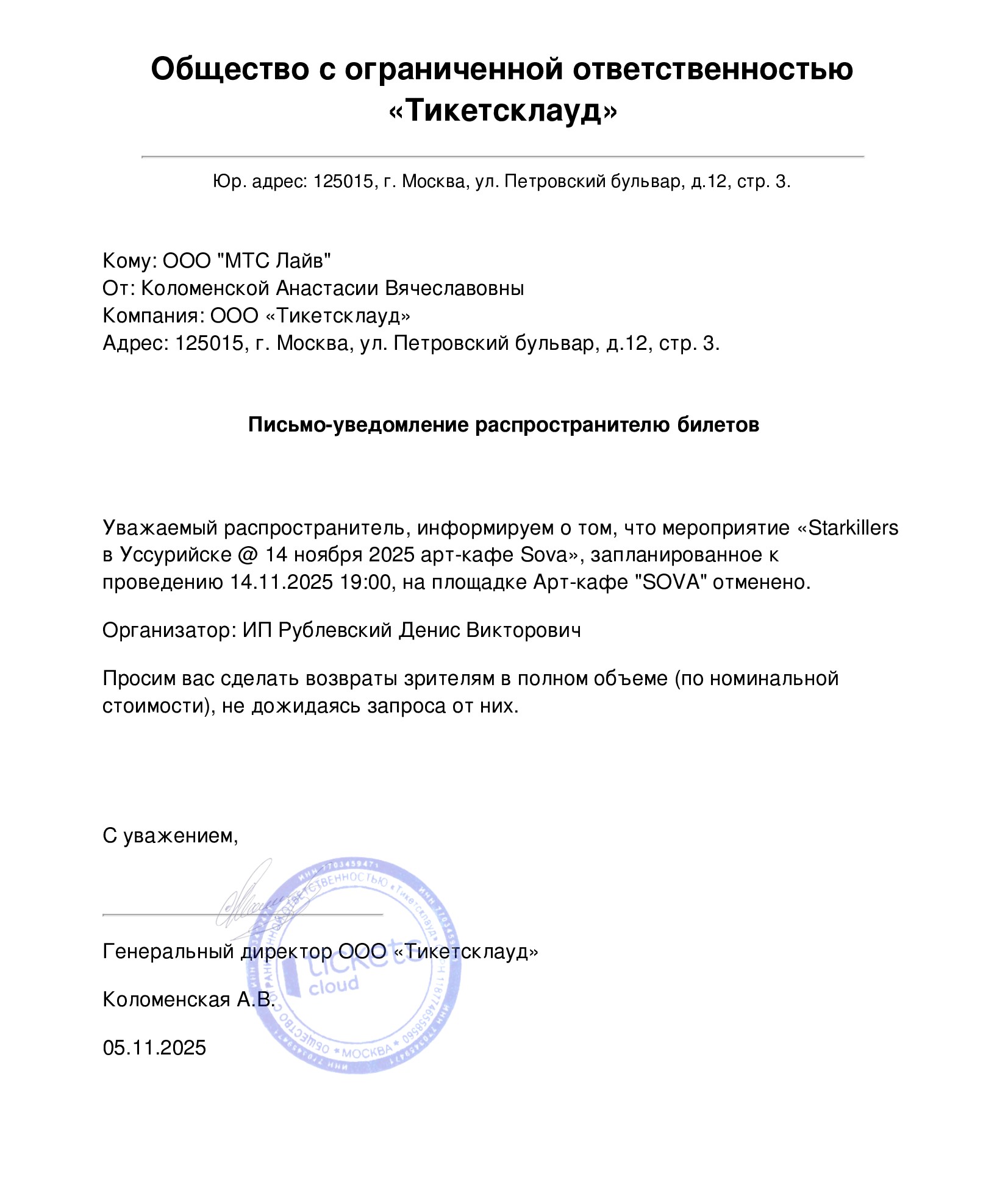 Уважаемый клиент! Спешим сообщить, что по информации, полученной от организатора, концерт группы Starkillers, запланированный на 14 ноября 2025 года в 19:00 в кафе «Sova», отменён. Деньги за электронные билеты вернутся автоматически в полном объёме на карту, с которой была произведена оплата. Если вы купили билет в кассе Ticketland.ru за наличный расчет, то обратитесь, пожалуйста, на почту: vozvrat@ticketland.ru. С уважением, команда поддержки Ticketland.