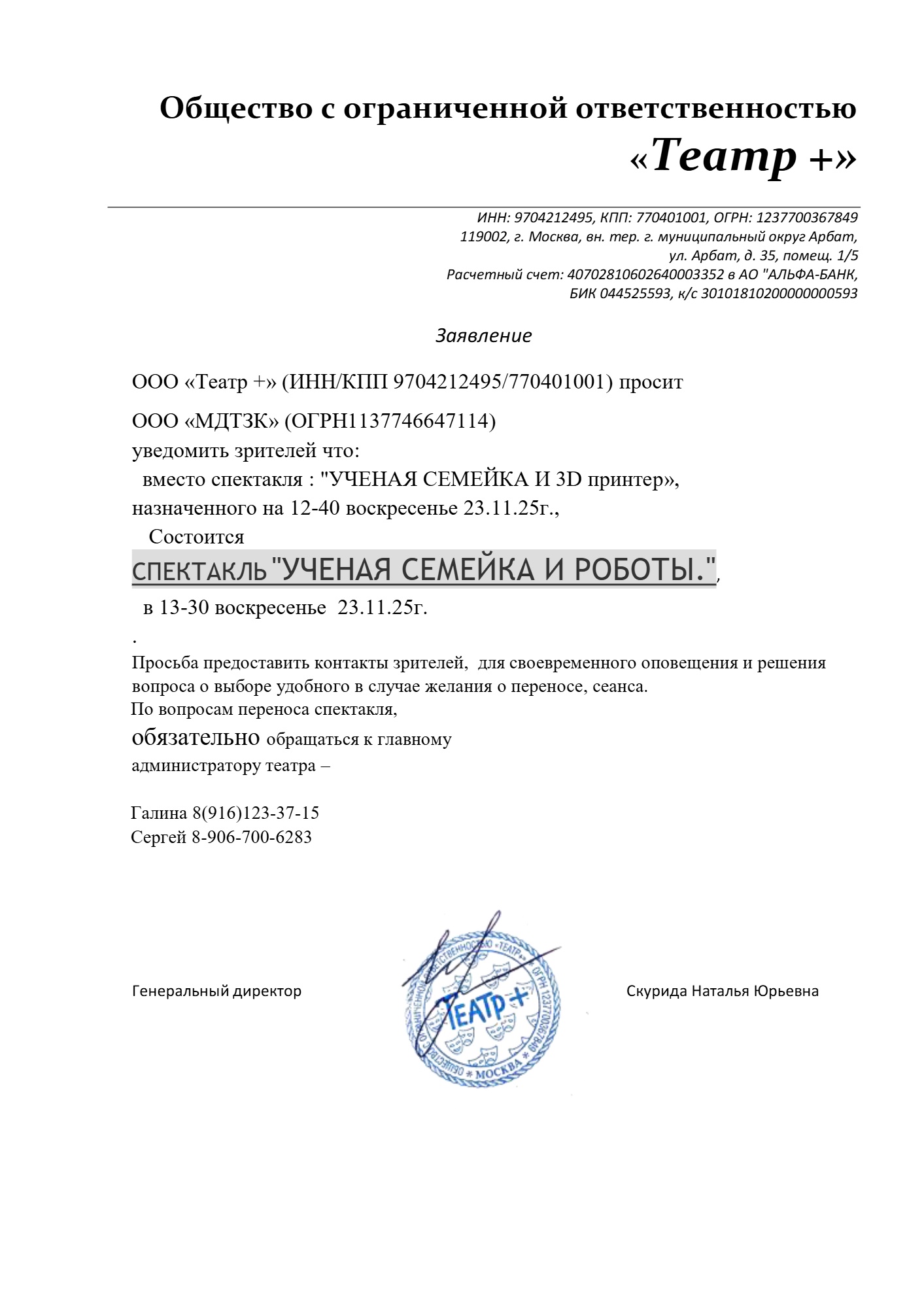 Уважаемый клиент! Спешим сообщить, что по информации, полученной от организатора, спектакль «Ученая семейка и 3D принтер», запланированный на 23 ноября 2025 года в 12:40 в Центральном доме актера, заменён со смещением времени начала. Вместо назначенного ранее мероприятия, 23 ноября 2025 года в 13:30 состоится спектакль «Учёная семейка и роботы» По всем вопросам обращайтесь, пожалуйста, к организатору по следующим контактным данным: Галина +7 (916)123-37-15, Сергей +7 (906) 700-62-83. С уважением, команда поддержки Ticketland