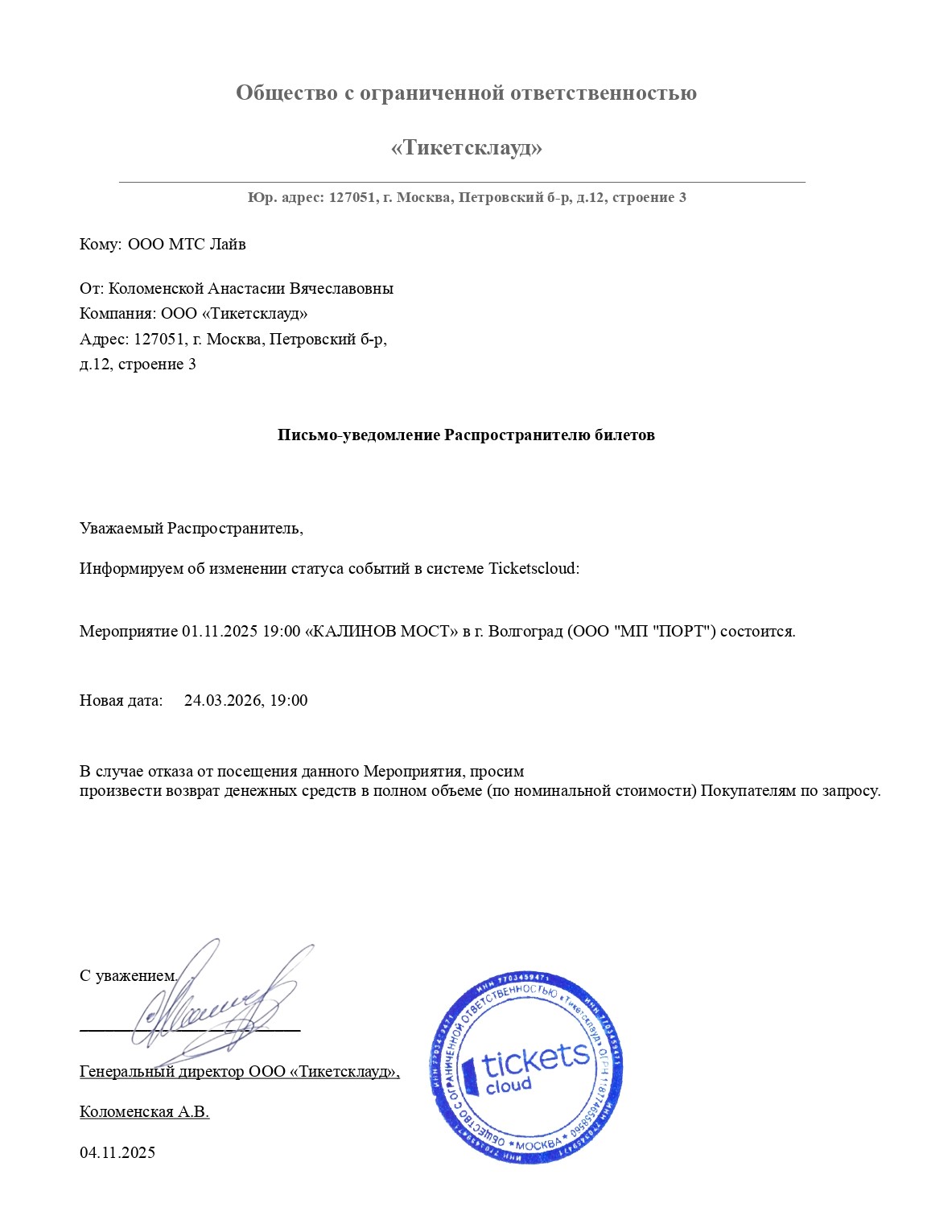 Уважаемый клиент! Спешим сообщить, что по информации, полученной от организатора, концерт группы «Калинов мост», запланированный на 1 ноября 2025 года в 19:00 в Kultura Concert Hall, перенесён на 24 марта 2026 года, начало в 19:00. Ранее приобретенные билеты действительны на новую дату, обменивать их не нужно. Если вам неудобно посетить концерт в новую дату, вы можете вернуть билет по кнопке в личном кабинете во вкладке «Заказы». Деньги за электронные билеты вернутся автоматически в полном объёме на карту, с которой была произведена оплата. Если вы купили билет в кассе Ticketland.ru за наличный расчет, то обратитесь, пожалуйста, на почту: vozvrat@ticketland.ru. С уважением, команда поддержки Ticketland.
