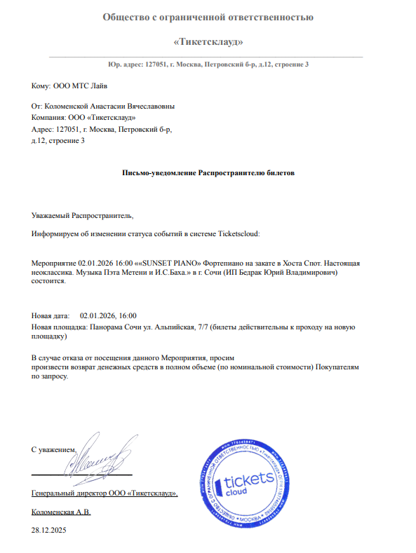 Уважаемый клиент! Спешим сообщить, что по информации, полученной от организатора, концерт «Sunset Piano. Фортепиано на закате. Настоящая неоклассика. Музыка Пэта Метени и И.С. Баха», запланированный на 2026-01-02 в 16:00 в Джаз клубе «Хоста Спот», состоится со сменой площадки. Новая площадка: Панорама Сочи ул. Альпийская, 7/7. Ранее приобретенные билеты действительны, обменивать их не нужно. Если вам не удобно посетить мероприятие на новой площадке, вернуть билет можно по кнопке в личном кабинете во вкладке «Заказы». Деньги за электронные билеты вернутся автоматически в полном объёме на карту, с которой была произведена оплата. Если вы купили билет в кассе Ticketland.ru за наличный расчет, то обратитесь, пожалуйста, на почту: vozvrat@ticketland.ru. С уважением, команда поддержки Ticketland